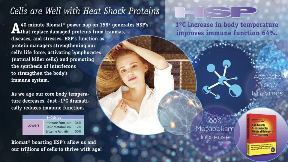 Immune System Function: The Biomat's far infrared therapy encourages the production of heat shock proteins (HSP), which strengthen the immune system by increasing the production of endorphins, T-cells, and lymphocytes. This helps the body fight off infections and diseases more effectively.